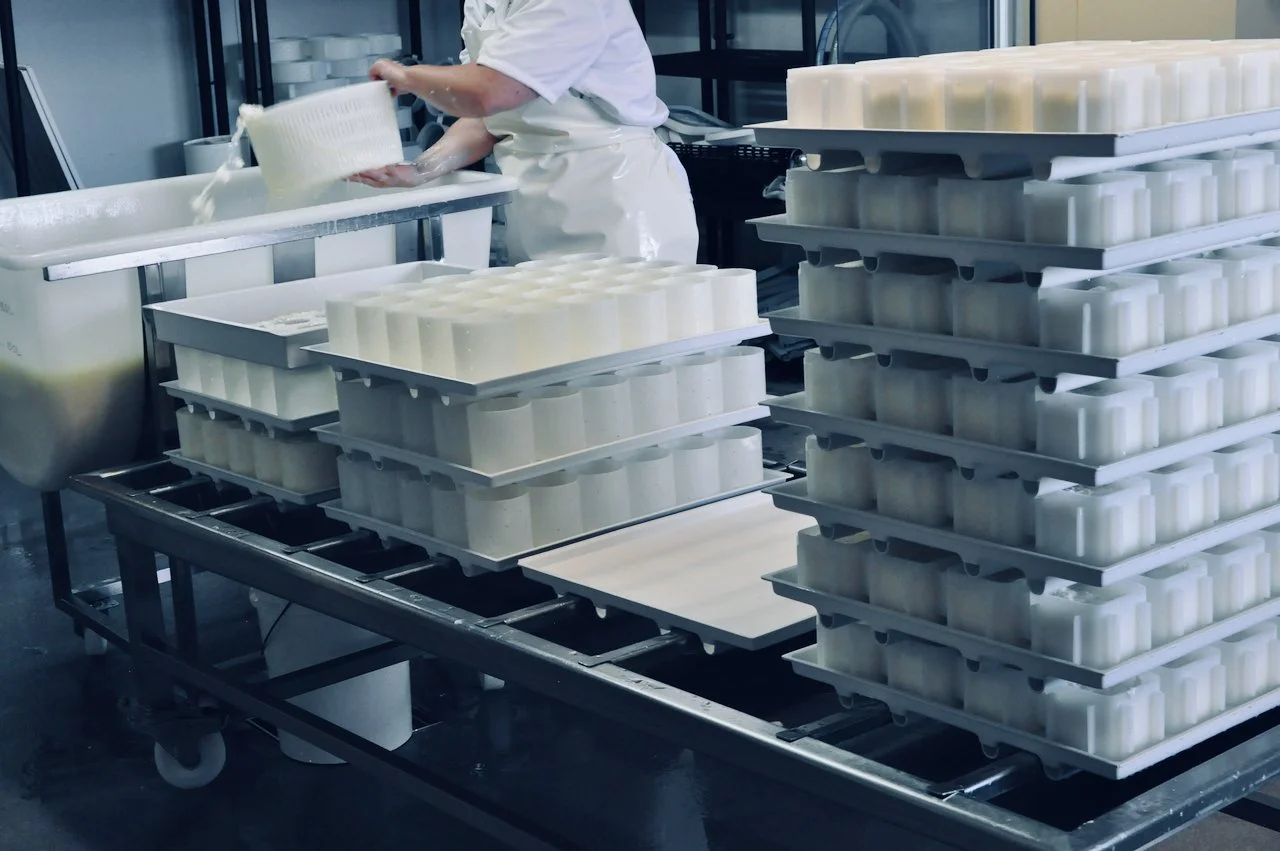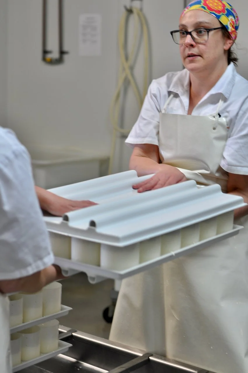 The filled hoops need regular turning to ensure the cheeses are draining and shaping themselves evenly. By placing an upside tray on top of another full tray of hoops you can flip the whole tray in one fluid motion, like turning a cake out to cool. For full trays of smaller cheeses, the size and weight of the trays make this a two person job. Facing your partner you first lift the tray a little to give it a firm bang: dislodging any pieces of curd that have stuck to the mat. Then, with one hand on top, one hand on the bottom and staring intently into each others eyes you flip the tray smoothly on the count of three. Each stack might have up to 10 or 12 trays of hoops and the flipping process happens multiple times, depending on your recipe. It feels a bit like a dance, and it’s very satisfying to hear the wheels all ‘flump, flump', flump’-ing into place as you flip.