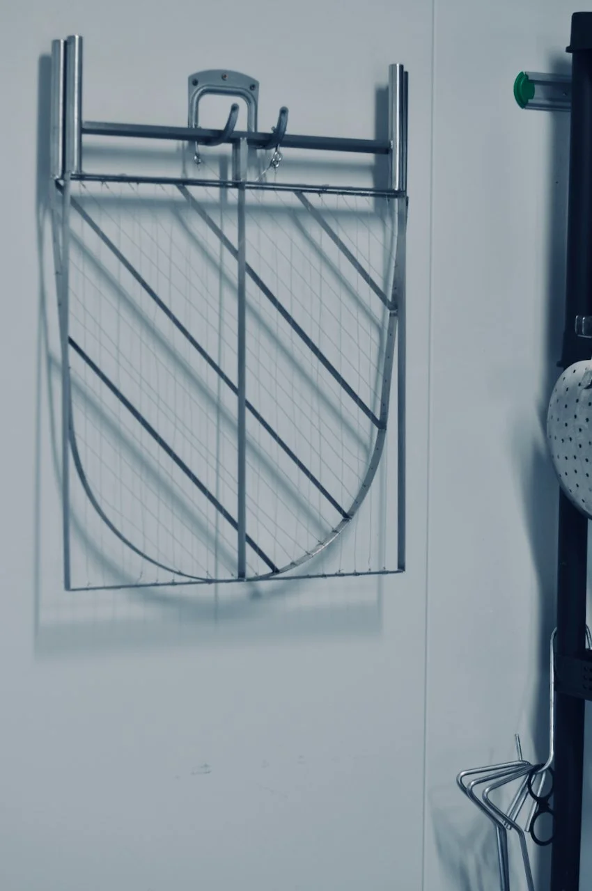 The next step is cutting the curds using (appropriately enough) a curd cutter: a large metal frame with taut wires strung about 2cm apart. Two handles at the top allow the cheesemaker to lower the frame into the vat and pull it through in a fluid motion. We used two different shaped cutters, one rectangular with vertical wires and one with an arched base and diagonal lines. Hanging on the wall they are vaguely reminiscent of the play-school windows. They are designed to precisely fit the shape of the vat, and cut neat pieces of curd. The curved base snugly ran down the full length of the vat while the square edge makes 3 cross-sections. We were advised to handle with care: a day of cheesemaking leaves your hands extremely soft and prune-y. The wire on a curd cutter could easily slice that vulnerable skin. If that happened while your hands were in a big batch of cheese, the whole vat would need to be thrown out. Stuff of nightmares.